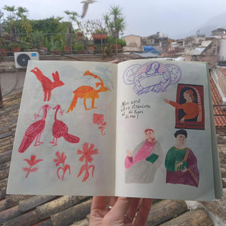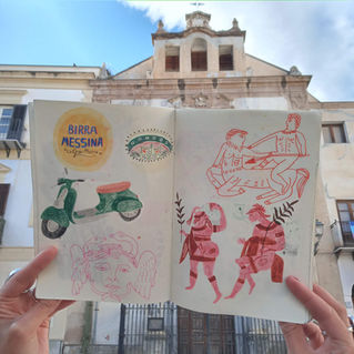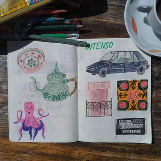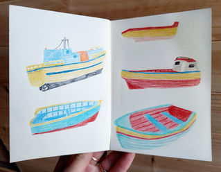 Chili, Italie, Espagne, États-Unis, Royaume-Uni, Pologne, France : extraits de carnets de route (crayons de couleurs, feutres, stylos, sur carnet MD Paper). Des dessins du quotidien, au fil du chemin. Des kilomètres de traits pour le souvenir.