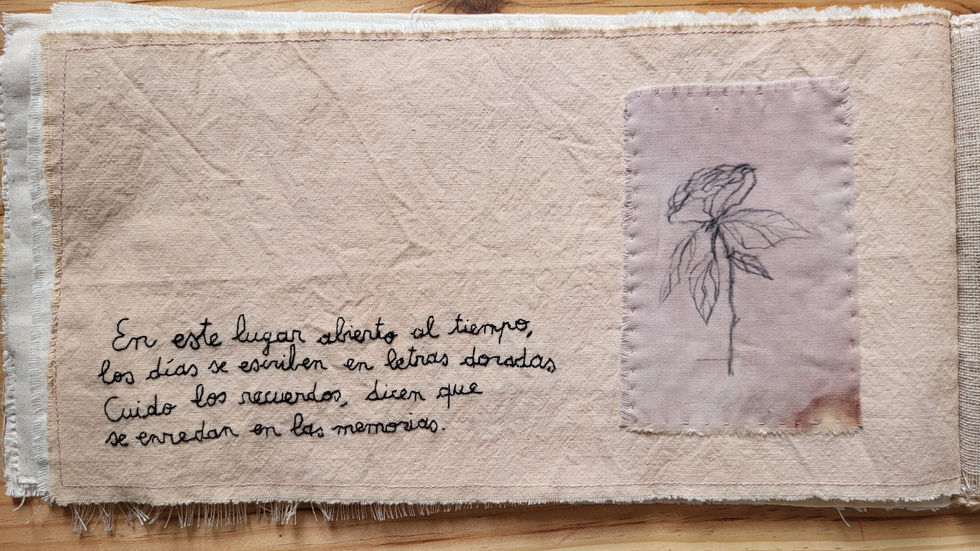 Ce livre textile naît à la frontière entre le silence et la présence, entre les souvenirs et l'oubli, entre la terre et le soleil qui teinte, l'absence et la rencontre. Ce sont 16 pages à toucher face au vide, traces des souvenirs d'un être cher qui continue à semer ses couleurs dans les pétales des fleurs.